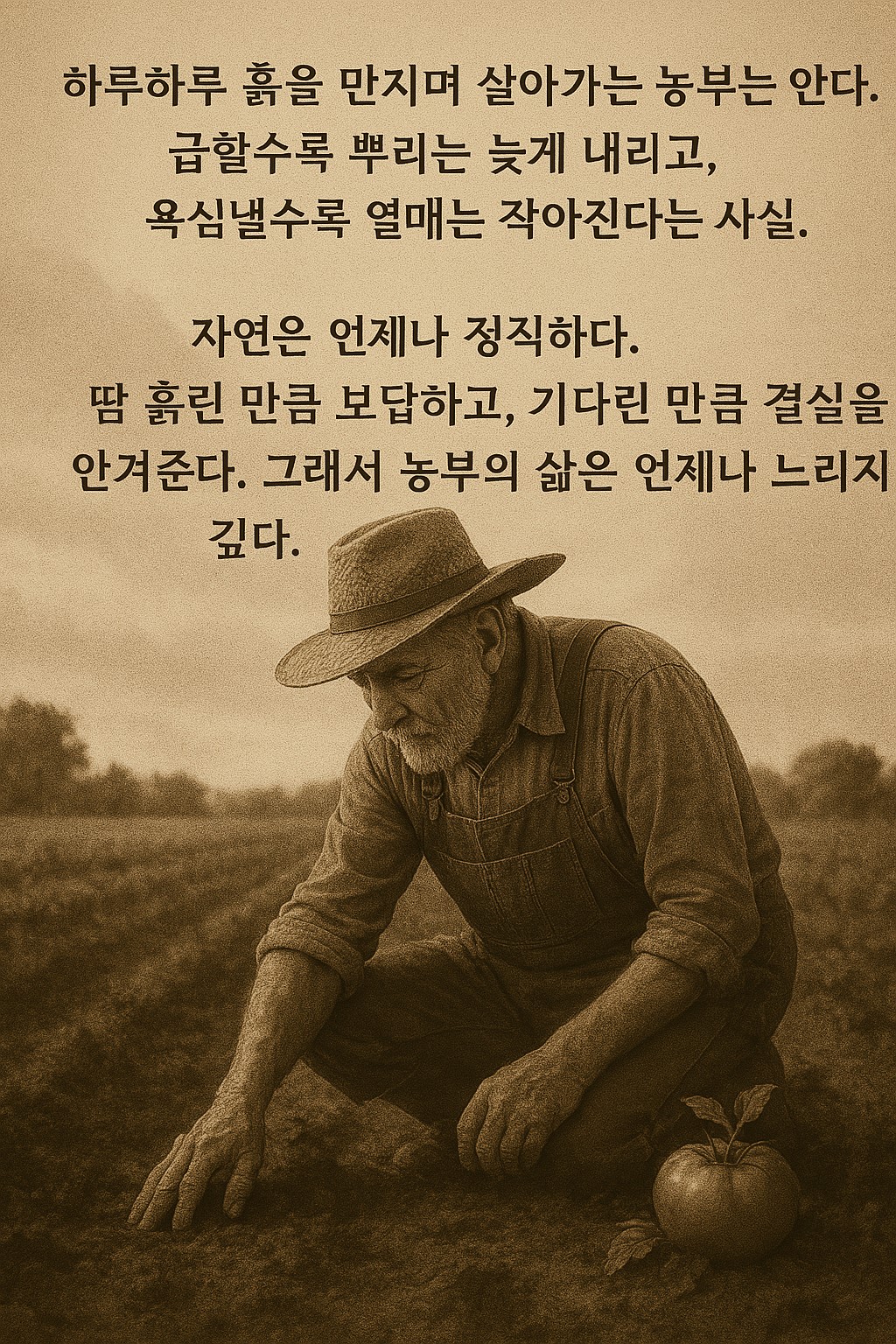 Farmer's Life 하루하루 흙을 만지며 살아가는 농부는 안다. 급할수록 뿌리는 늦게 내리고, 욕심낼수록 열매는 작아진다는 사실. 자연은 언제난 정직하다. 땀 흘린 만큼 보답하고, 기다린 만큼 결실을 안겨준다. 그래서 농부의 삶은 언제나 느리지만 깊다. 카테고리 없음 2025.03.30
